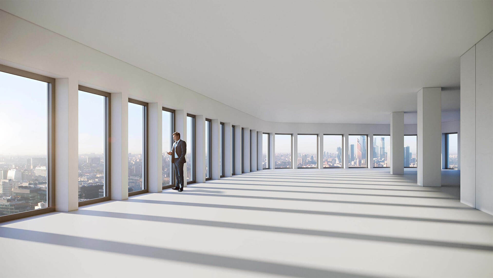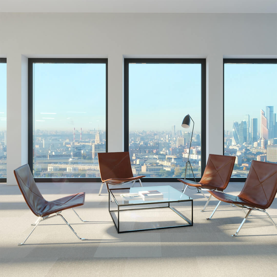 Одной из ключевых особенностей являются окна в пол, обеспечивающие отличную инсоляцию и равномерное распределение естественного света. Каждый этаж включает 98 окон высотой 2,7 метра, выполненных из теплого алюминиевого профиля Schüco или его аналога. Архитектурное энергосберегающее стекло с однородным цветом разработано для сложных климатических условий: оно сохраняет тепло зимой и прохладу летом, снижая энергозатраты.