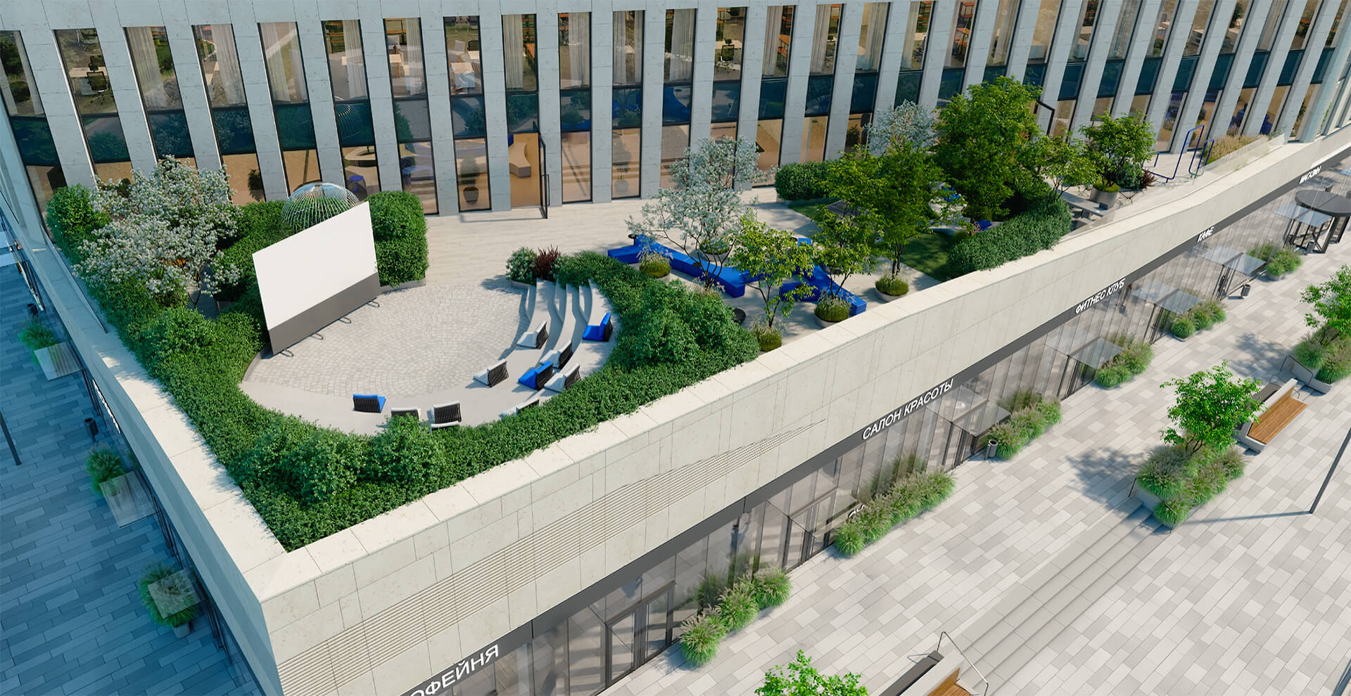 Для отдыха и неформального общения предусмотрена благоустроенная открытая территория площадью 1 000 м². Пространство спроектировано для проведения встреч, отдыха на свежем воздухе и создания баланса между работой и личным временем.